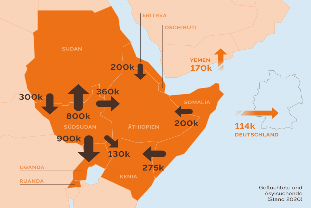 Die meisten Menschen finden Zuflucht in den Nachbarstaaten. Allein in Uganda leben 900.000 Geflüchtete aus dem bürgerkriegsgeplagten Südsudan, während vom gesamten Horn von Afrika lediglich 114.000 Geflüchtete und Asylsuchende in Deutschland ankommen (Stand 2020).